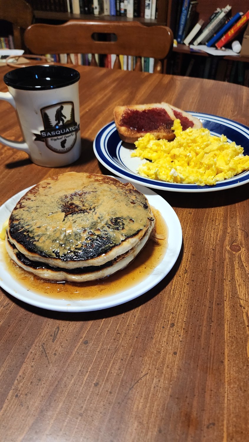 Pancakes top with peanut butter and syrup along with the best fluffy eggs recipe taken from this book: